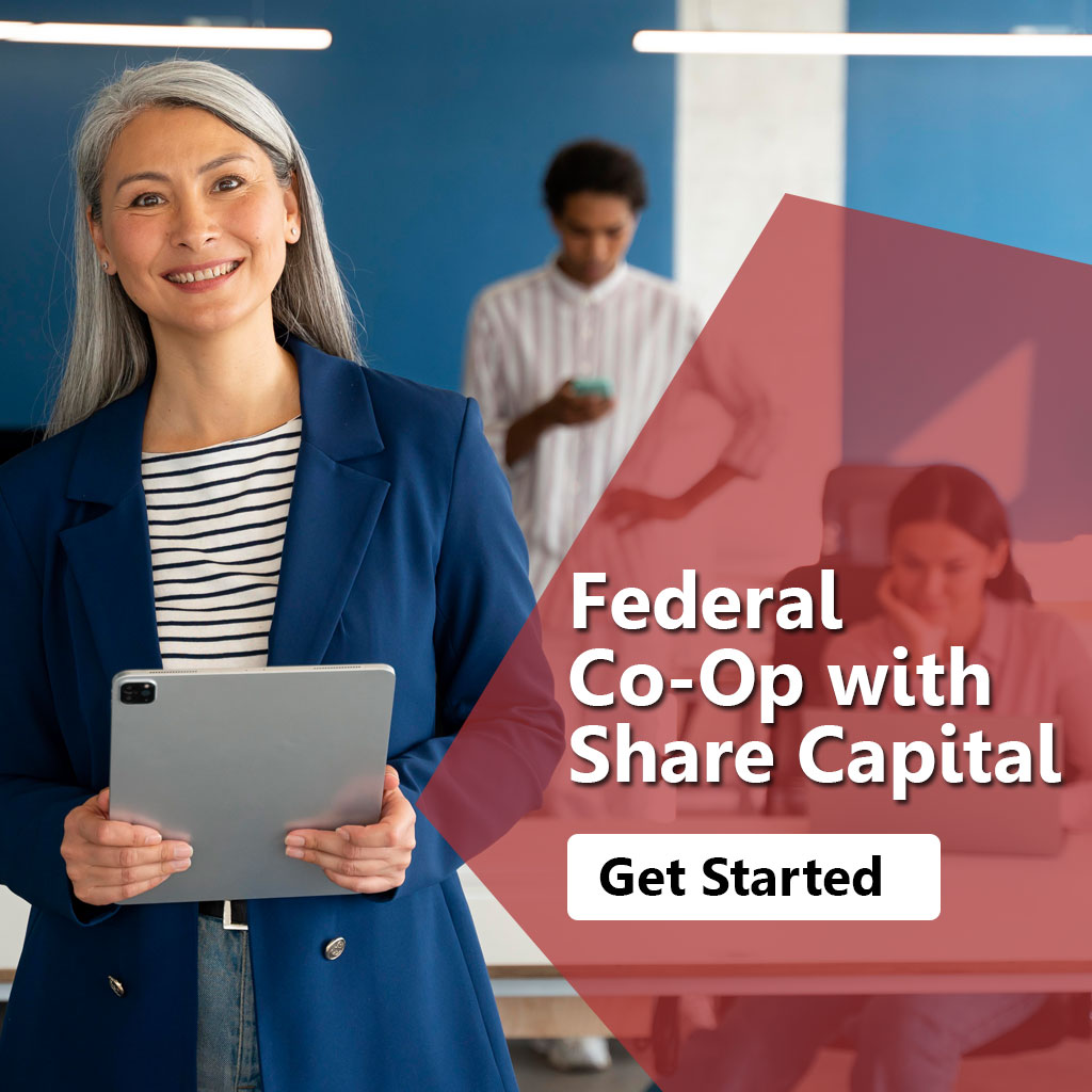 A Federal Co-Op with share capital in Canada is a cooperative that operates under the Canada Cooperatives Act and is structured to include share capital. This means that it issues shares to its members, who contribute equity to the cooperative. Minimum of 3 directors are required to start a Federal Co-Op, 25% of directors must be Canadian Citizens or Permanent Residents.
